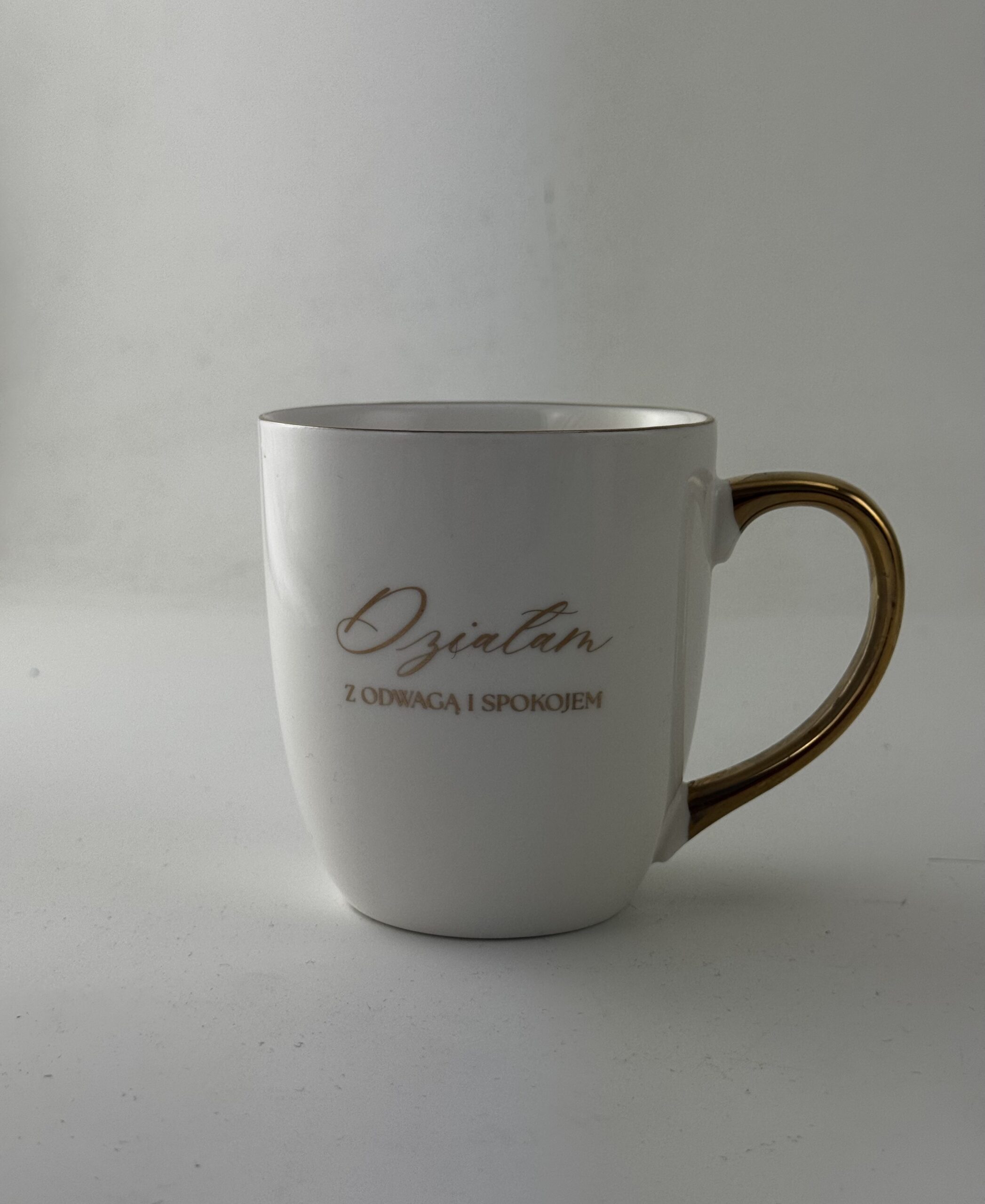 Biała ceramika z połyskiem i złotym napisem: „Działam z odwagą i spokojem”