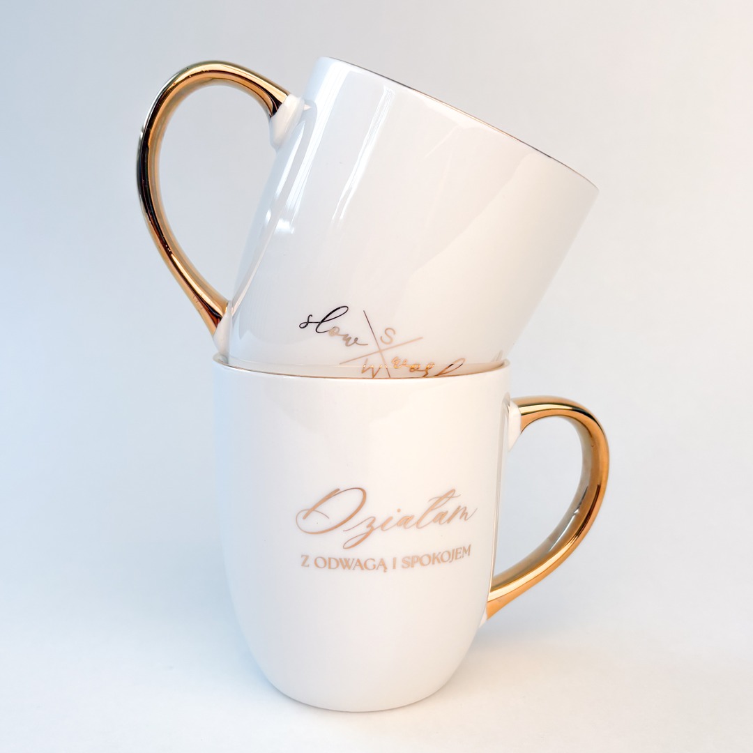 Poranek z kawą, wieczór z herbatą, chwila oddechu w ciągu dnia – niech Twój ulubiony napój przypomina Ci, że możesz działać z odwagą, ale bez pośpiechu. Ten elegancki kubek w bieli i złocie nie tylko pięknie wygląda, ale też niesie ze sobą ciepłe przesłanie na każdy dzień.